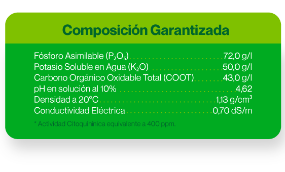Cytoplant®- 400, es un promotor fisiológico de origen vegetal que posee una alta concentración de citoquininas naturales.