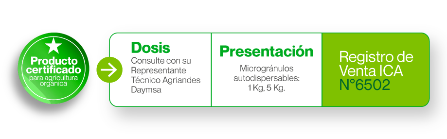 - Su presentación en forma de microgránulos totalmente solubles, facilita su preparación y almacenaje.