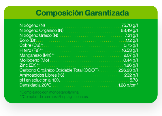 Es un bioestimulante complemento del abonado NPK para cultivos con altas exigencias productivas. En su composición se encuentra perfectamente equilibrados los aminoácidos libres en alta concentración, estando además enriquecidos con microelementos. Es un estimulante del cultivo durante su etapa de crecimiento